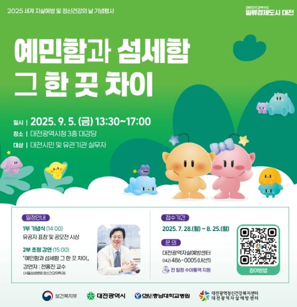 대전시는 오는 9월 5일 오후 2시 시청 대강당에서 ‘세계 자살예방의 날(9월 10일)’과 ‘세계 정신건강의 날(10월 10일)’을 기념하는 2025년 세계 자살예방 및 정신건강의 날 기념행사를 개최한다.